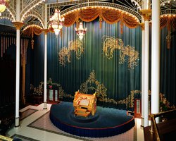 The nucleus of the theatre organ, which was previously installed in the old music room (Wurlitzer opus #1571, built in 1927 for the Riviera Theatre in Omaha) has been expanded to 80 ranks of pipes. The overall result is the most versatile orchestral theatre pipe organ ever built. Behind the scrim are five chambers containing pipes, percussions, wind regulators and controls in a four-story-tall area. The console is patterned after the original from Chicago's Paradise Theatre; it is mounted on the original Peter Clark lift from the Granada Theatre, which raises it from the lower level cage enclosure up to concert playing position. Mounted on the wall to the left are the 32' Diaphone pipes, and to the right are the 32' Bombarde pipes. A 32-note set of Deagan Tower Bells, the largest of which weighs 426 lb., hang on each side of the room. They are activated by huge solenoids from their own console, the organ console, a roll player, and even the doorbell button. To the rear of the room, the 'Ethereal' pipe chamber in the attic echoes softly from the skylight area, while the brass 'Trumpet Imperial' and copper 'Bugle Battaglia' speak with great authority from the back wall. The organ is connected to a computer, which records the playing of the organist on computer disc, ready to be played back at any time. Spotlights and other lighting effects may also be recorded, so the lighting changes during a concert can be 'played back' with the music.